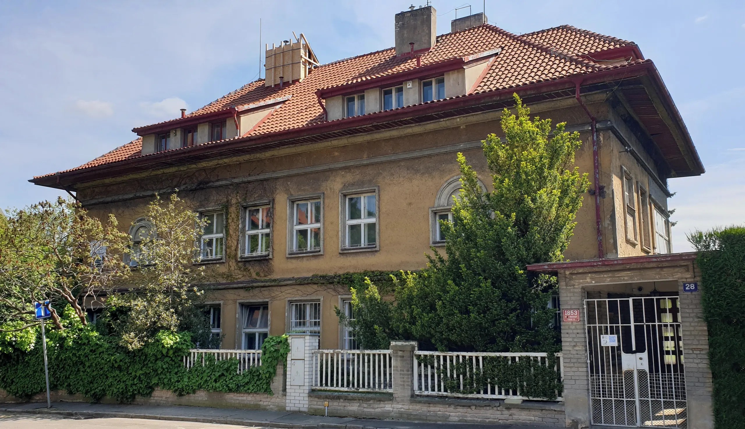 Dvojdům Karla a Josefa Čapka, realizovaný ve vilové kolonii Stavebního a bytového družstva odboru městských úředníků při všeúřednické besedě na Královských Vinohradech podle projektu Ladislava Machoně v l. 1923-24 Patrová dvojvila v zahradě, obdélného půdorysu, završená valbovou střechou s nízkými vikýři.